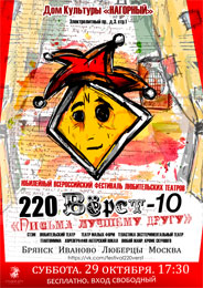 Десятый фестиваль правильных театров «220 верст» прошел 29 октября 2022 г. на Большой сцене ДК «Нагорный» г. Москвы.